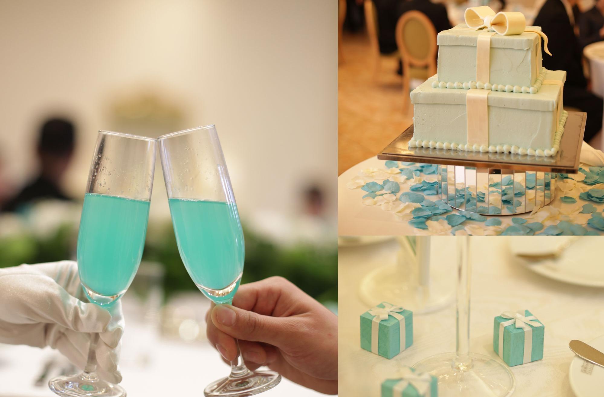 披露宴会場は一面”BLUE”で統一! 乾杯のドリンクもオリジナルのリキュールを使いました!ケーキも、もちろん”BLUE”。各テーブルに置いたプレゼントボックスは新婦が1つ1つ色を塗ってリボンをかけたこだわりのアイテムです。
