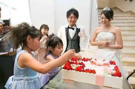 登場したケーキは実はまだ未完成のもの。 ずっと憧れていた夢を叶えることができるのはお子様のおかげ。感謝も込めてウエディングケーキは家族4人でつくりたい。そんな想いから2人のお子様にクッキーの飾りつけをしてもらいました。お2人もチョコペンで名前を記入。 家族4人で一緒にケーキを完成させました!