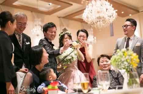 再入場の演出として ご新郎様の自撮り棒で撮影する各卓フォトのお時間を作りました。撮影したお写真をみてみんなで笑いあったり…おふたりとゲストが近い距離で笑いあえる笑顔が溢れる時間になりおふたりもゲストも自然と笑顔に…!