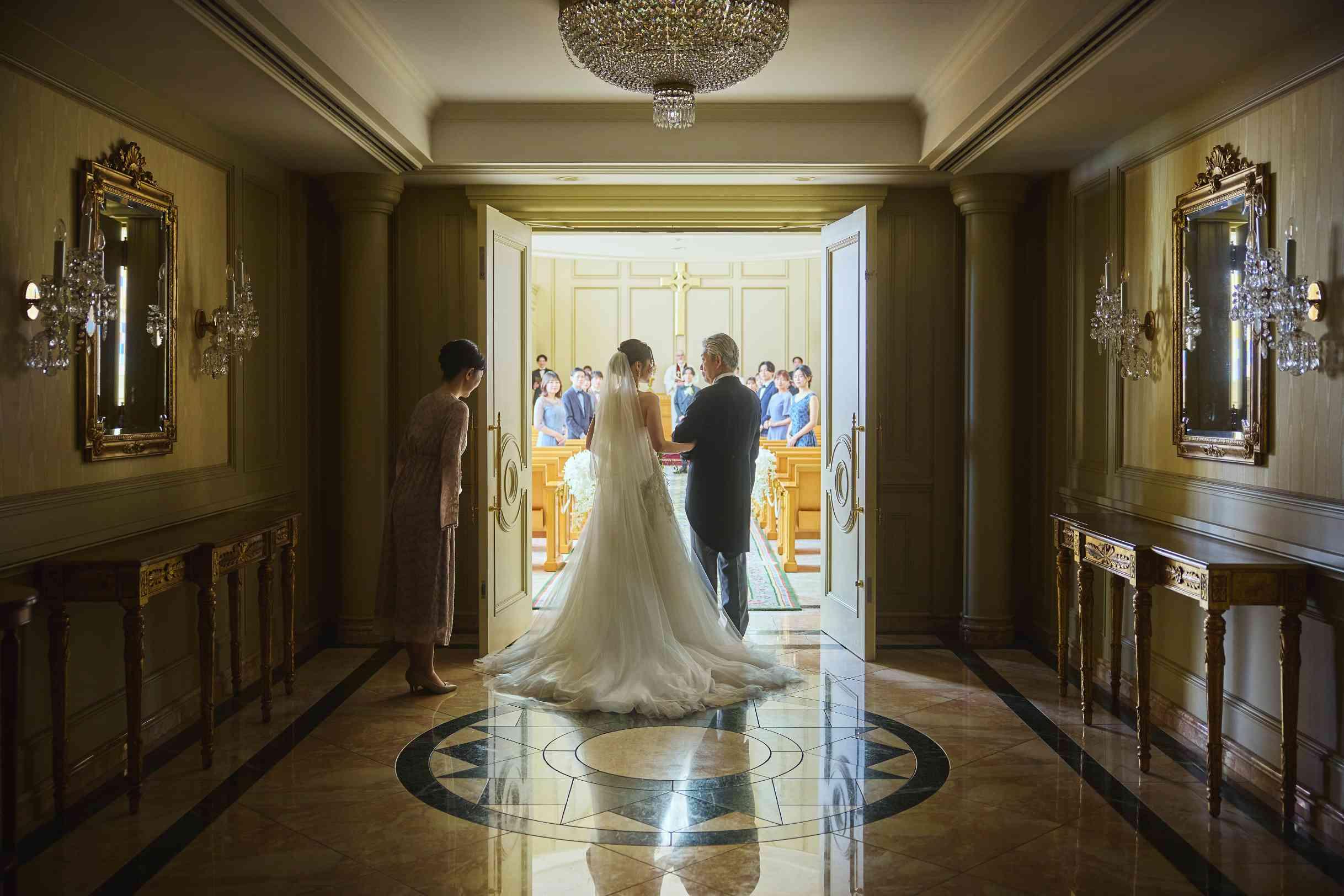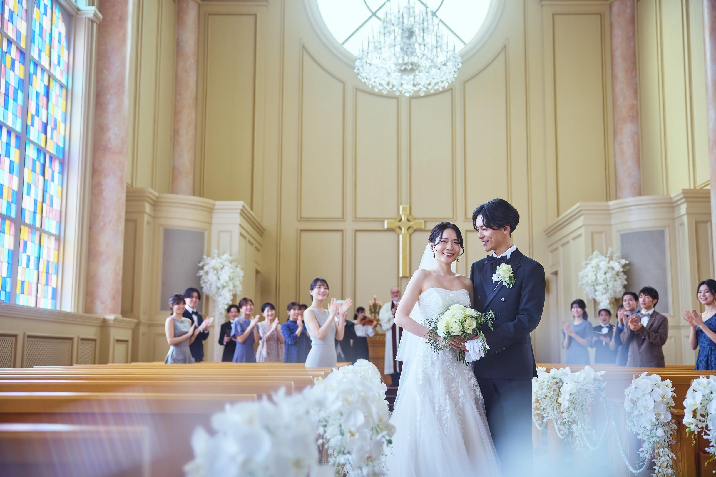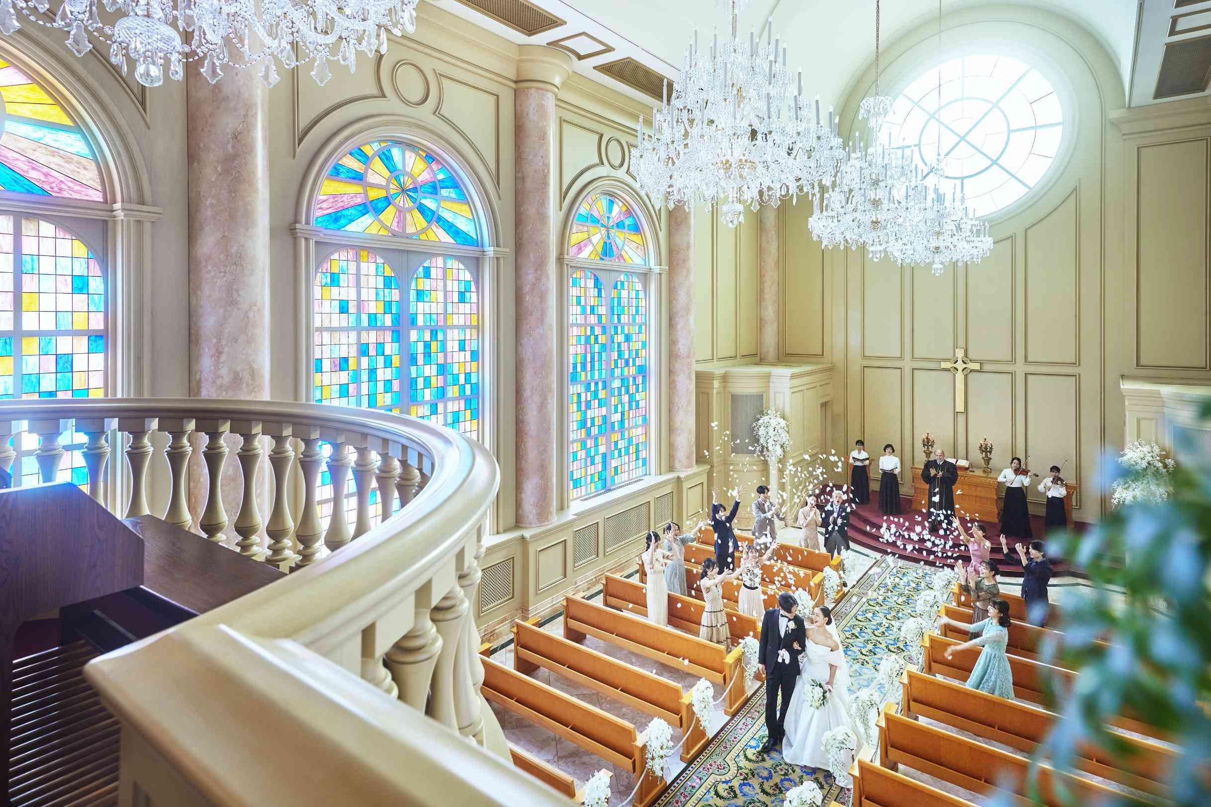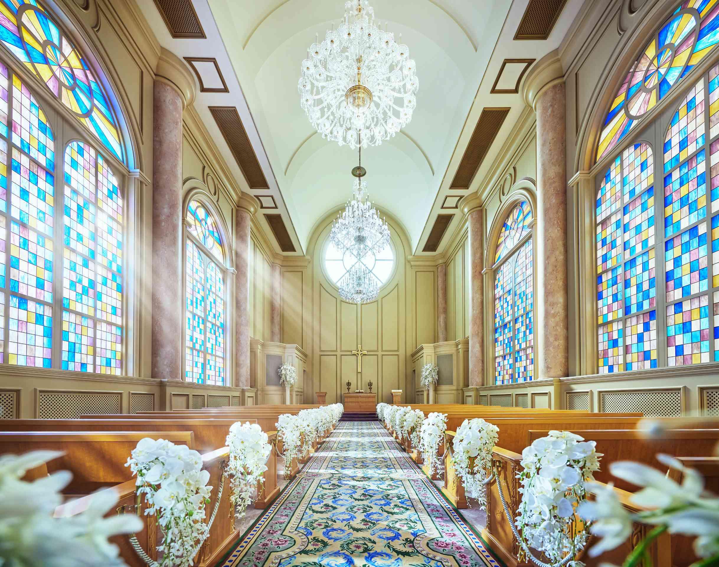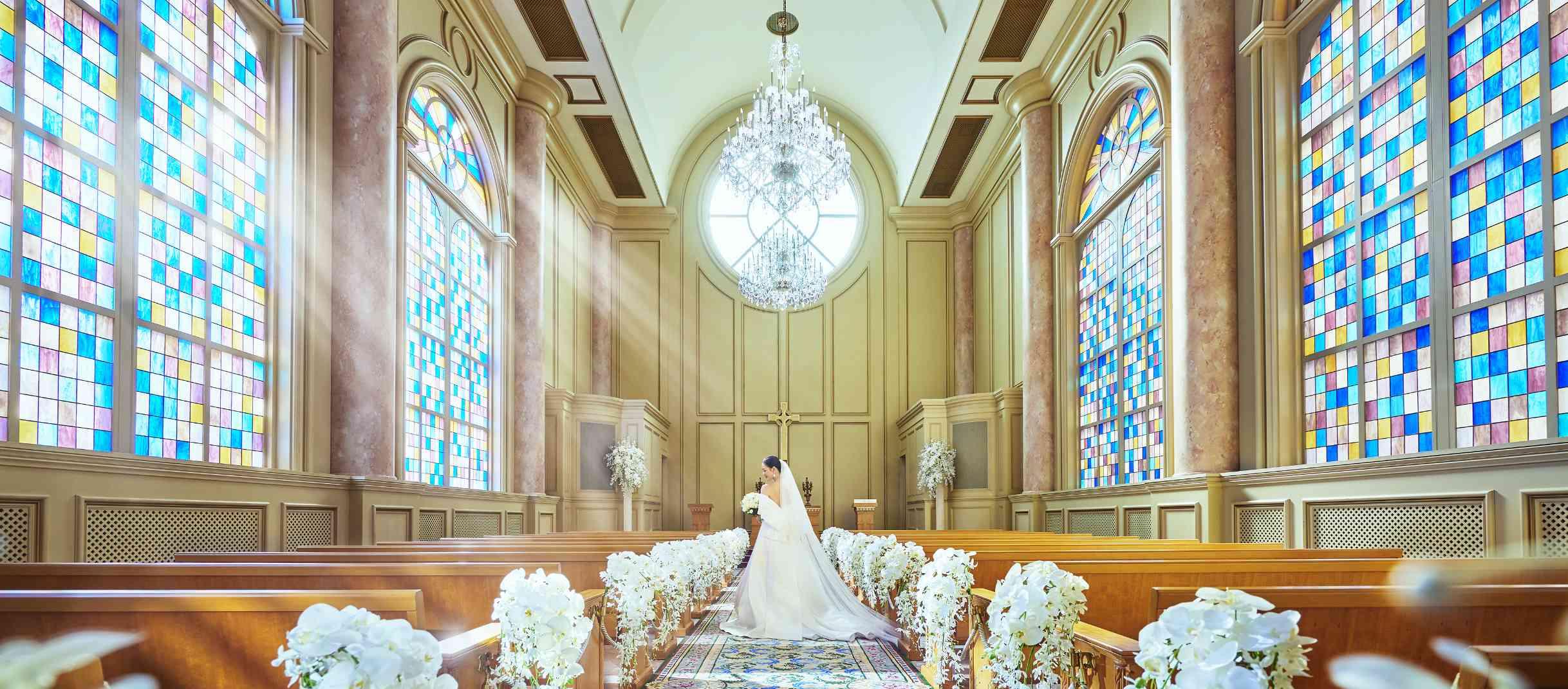 【2026年8月までの挙式がお得】天井高12.5mの大聖堂に4基のシャンデリアが煌めき、15mのバージンロードが続く圧巻のスケール。ステンドグラスからの自然光に包まれた花嫁姿は、誰もが息をのむ美しさ。