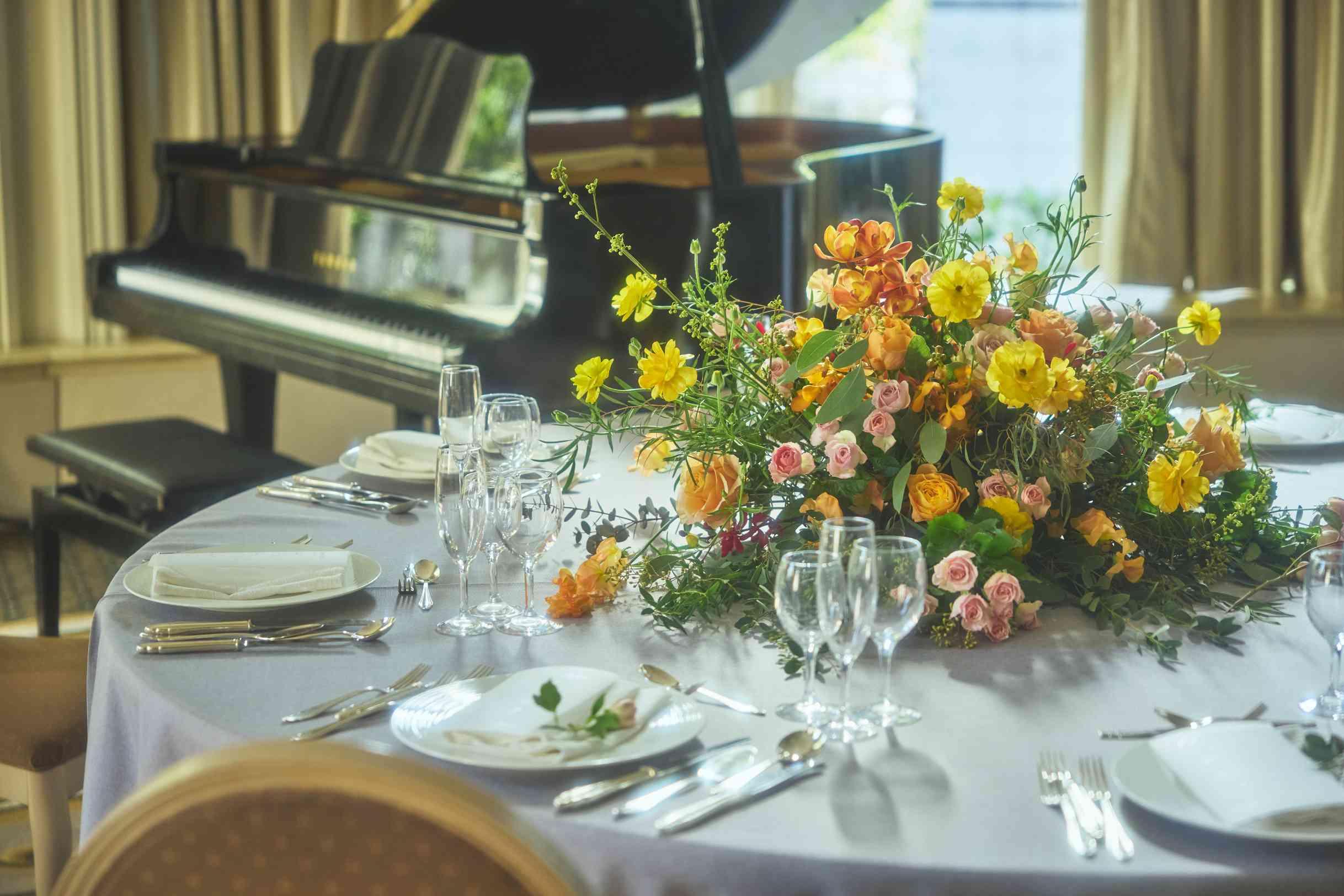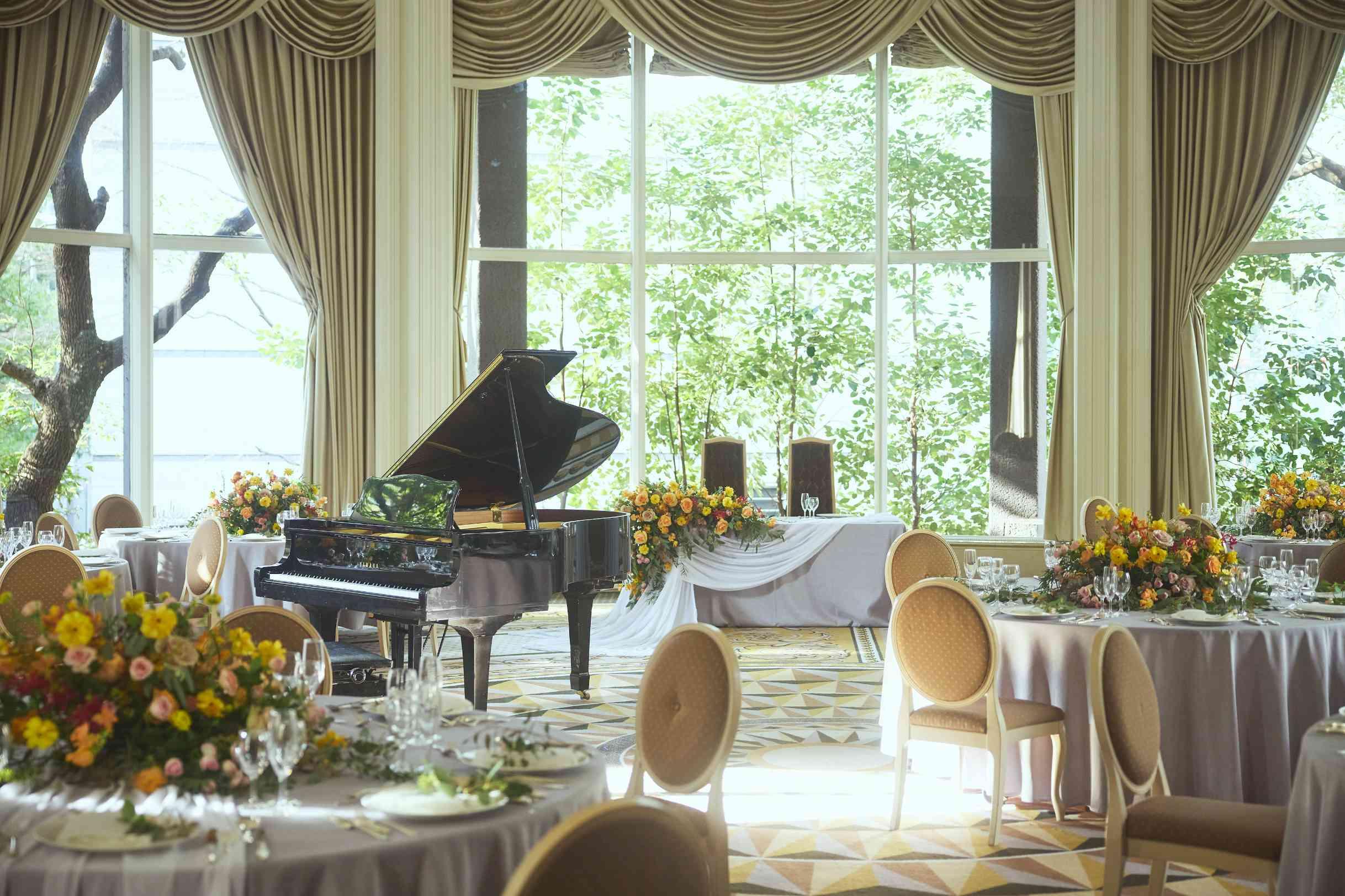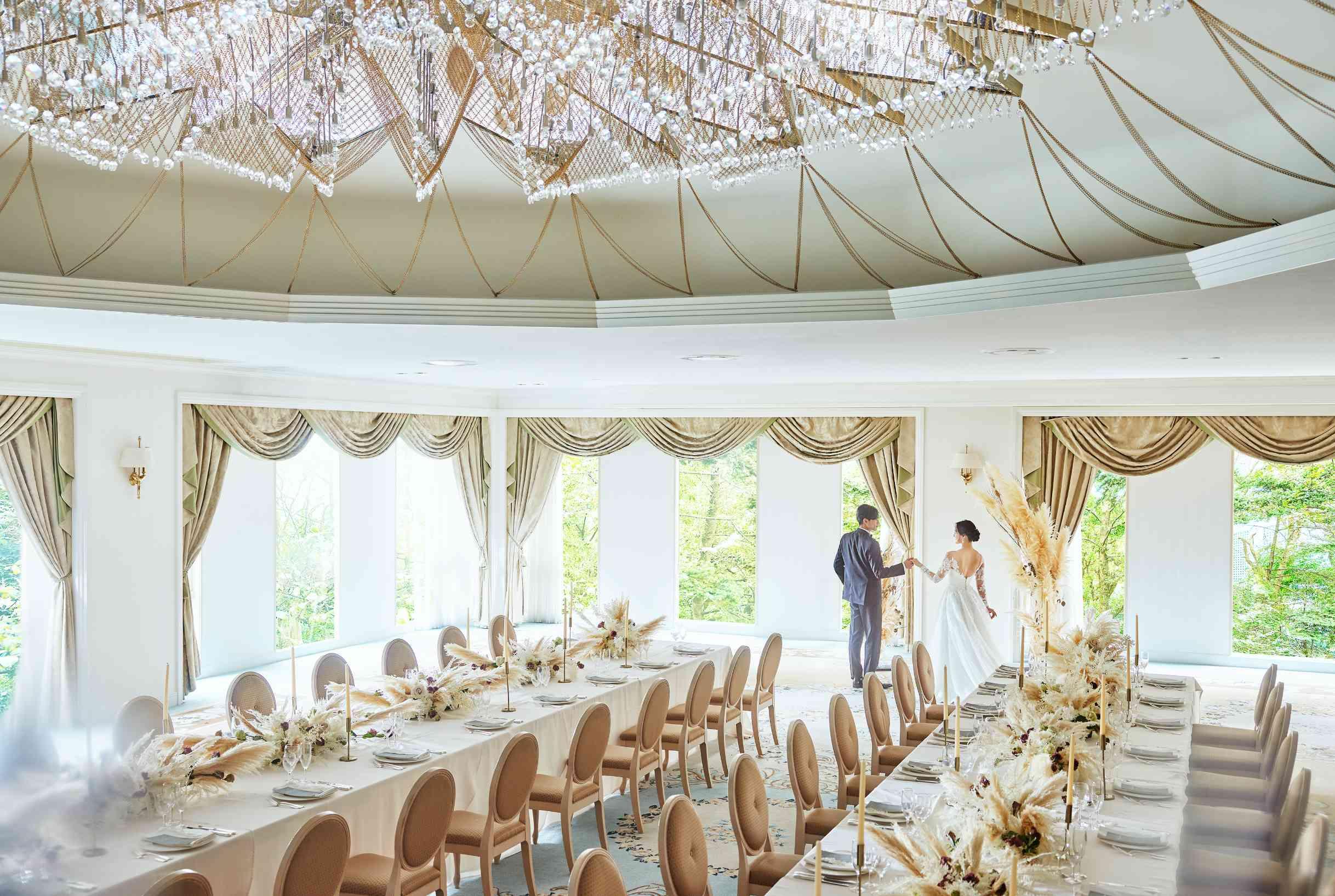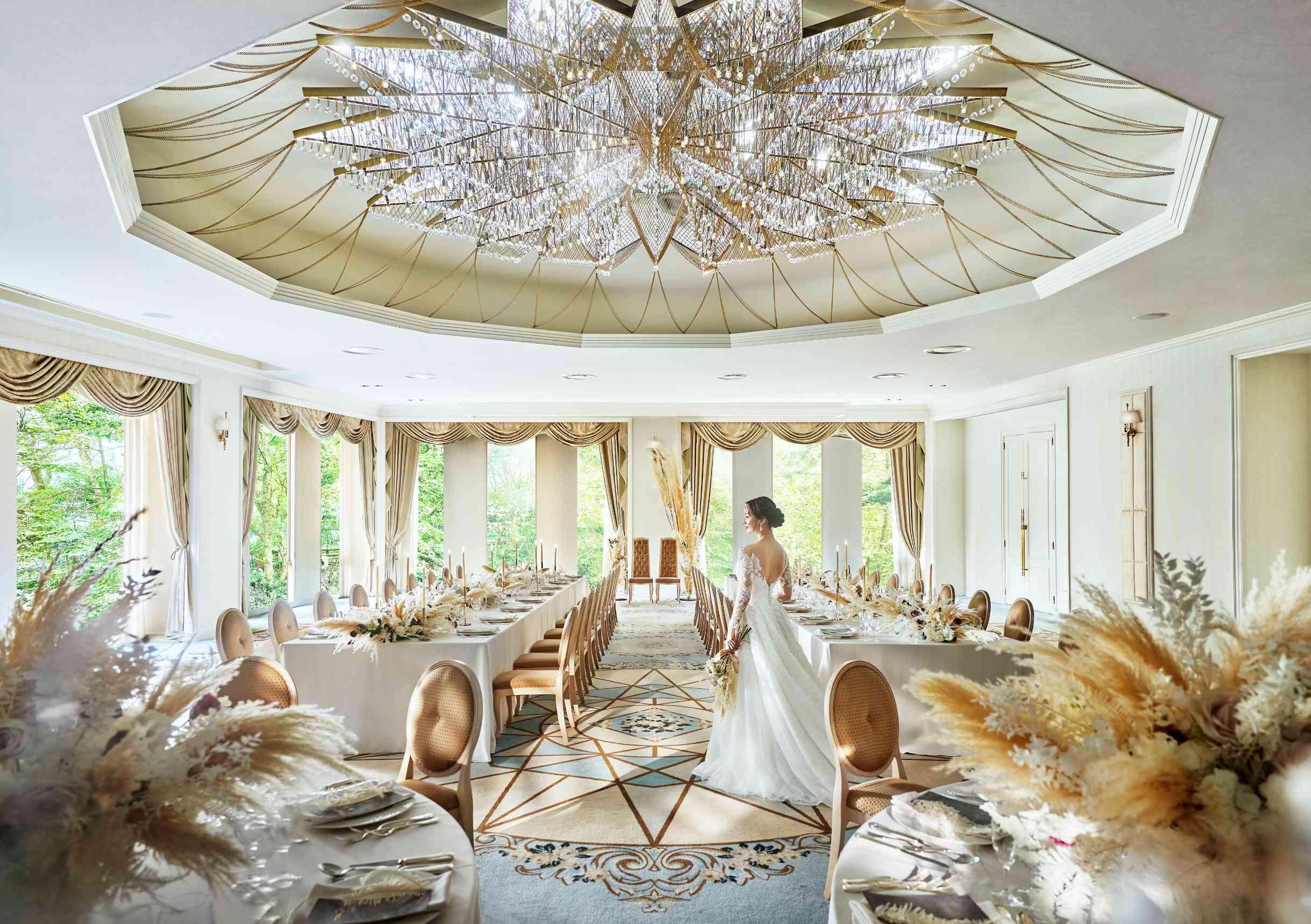 ほぼ360度ある大きな窓から緑と光が降り注ぐ開放的な空間。シャンデリアが輝くラグジュアリーな雰囲気で、ゲストと笑顔あふれる和やかなパーティを。自然に囲まれた贅沢な時間を心ゆくまで楽しめます。