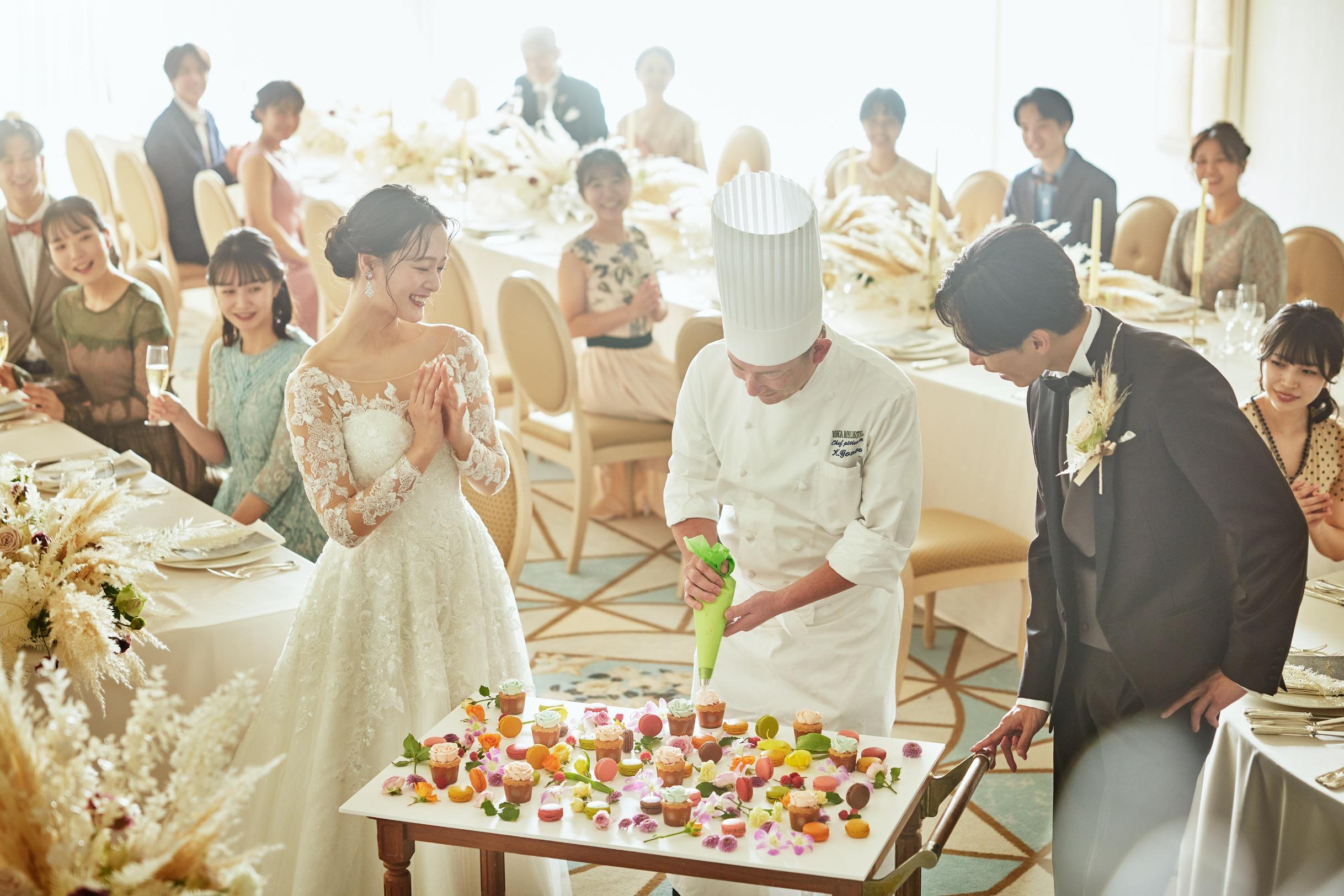 オードブル~デザートまでおふたりのが1皿ずつ選べるプリフィックススタイル。 実際のメニューから人気の3品を本番と同じサイズでお楽しみいただけるコース試食付きフェアは週末限定開催