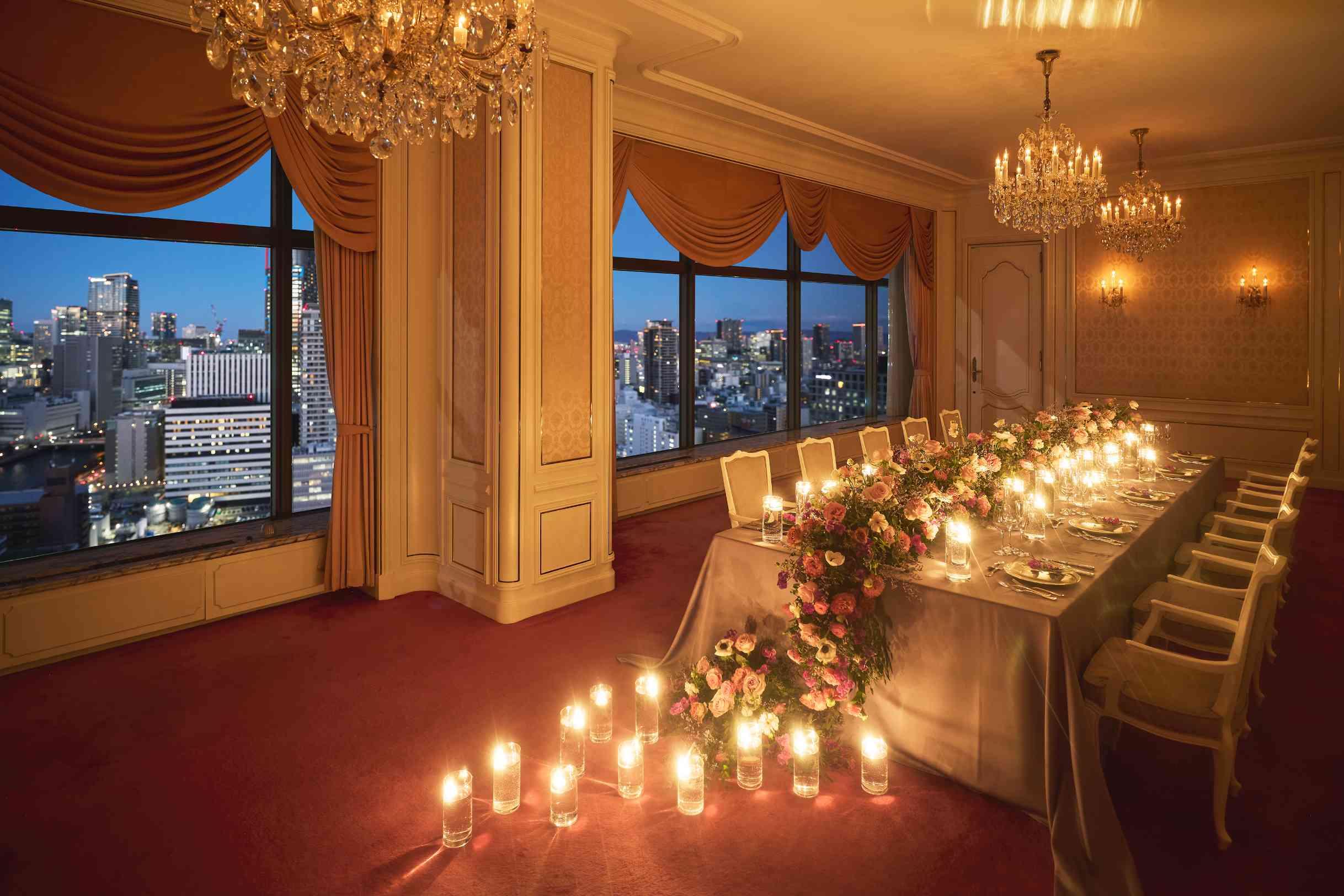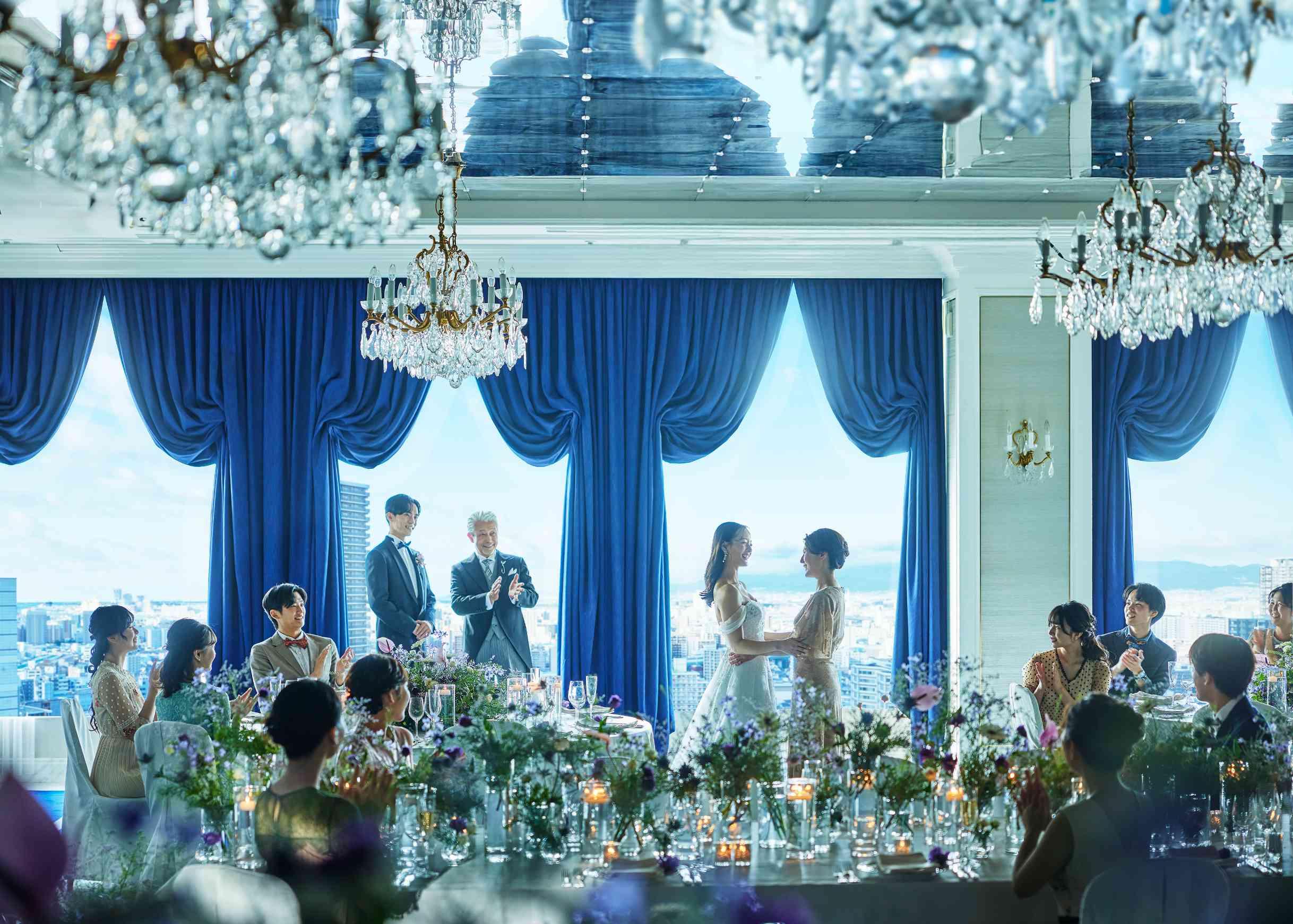 【大阪市街を一望できる高層階ウエディング】ラグジュアリーな設えや鏡張りの天井。すべてがゲストをお迎えするにふさわしい場所。ナイトウエディングもドラマティックに演出も。
