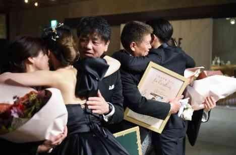記念品贈呈の後にハグタイムを。まずは新郎新婦様から親御様に向けて感謝のハグを贈り、強く抱き合う姿にゲストの心も引き込まれます。続いて相手の親御様へもハグを交わし、結びにご両家お父様同士、お母様同士でハグ。二つの家族が溶けあうようにひとつになり、新しい家族の誕生を祝うような温かい拍手が会場内を包み込みました。