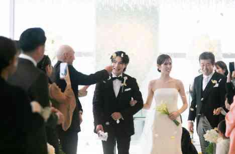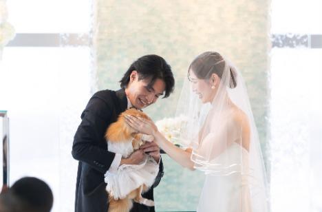 大切なリングを運ぶ大役を務めたのは、おふたりの愛犬「ちくわちゃん」。扉がオープンした後、果たしてちくわちゃんがどのような行動を取るのか、ゲスト参加型のクイズも開催され会場は期待に包まれました。大勢のゲストに見守られながら、まるでおふたりの門出を心から祝福するかのように、一歩ずつ力強くリングを届けてくれたちくわちゃん。新郎新婦様と愛犬、そして家族の深い絆と温かさを感じる、笑顔溢れる挙式となりました。