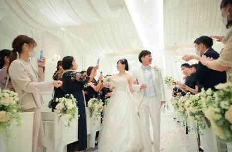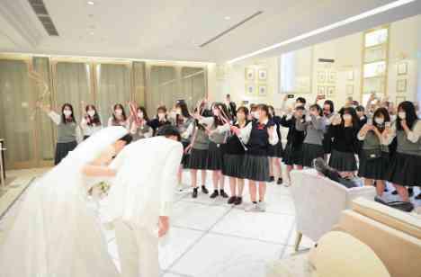 ご新婦様は、生徒さんから慕われる先生です。「先生のウェディングドレス姿を見たい♡」「先生におめでとうを伝えたい!」そんな想いで沢山の方たちが集まってくれました。挙式後に生徒さんたちが待つロビーへご新郎様とご新婦様が登場!待ちに待った登場に、「かわいい♡先生大好き!」と歓声が沸き、大盛り上がりのお時間でした♪