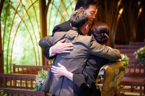 親御様や、ご家族様へのお気持ちを強くお持ちのお2人。ご両家様それぞれ、ご家族様とのお時間を挙式前に設けさせていただき、感謝のお気持ちをまっすぐにお伝えいただきました。新郎様からサプライズで親御様へお手紙をお読みいただき、思いを受け取られた親御様と新郎様で思わず抱き合う瞬間をとらえた一枚です。皆様の表情が素敵です。