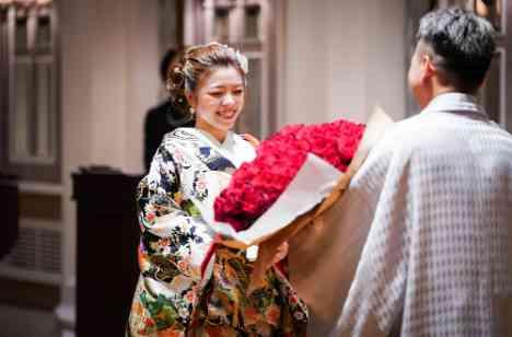 新郎様からサプライズで花束をお送りいただきました。「永遠の愛」「ずっと一緒にいてください」という意味合いがある99本の赤バラの花束。装花の本数や、花言葉など、様々な意味合いを考慮し、新郎様と当会場のフラワーコーディネーターが相談をさせて頂き、世界に一つの花束を作成させていただきました。フラワーコーディネーターもお2人専属のスタッフがいるからこそ、お2人に寄り添ったご提案をさせて頂いております。