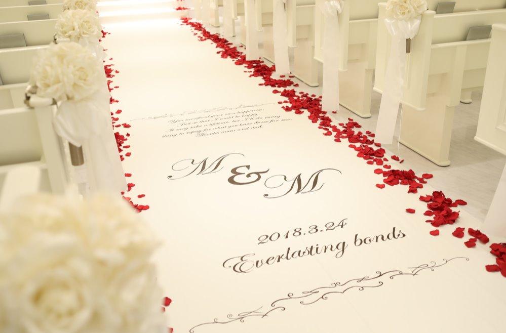 お二人は当初よりイニシャルやコメントが描かれたバージンロードを手作りしたいと要望がありました。会場のフラワーコーディネーターと一緒に文字などを打合せし、お二人に文字を描いて頂きました。文章には親御様への感謝の気持ちを英字にして描いています。