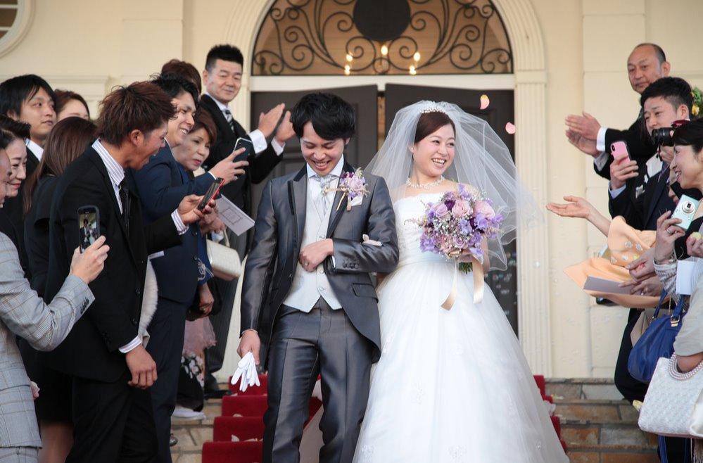 挙式後は憧れの大階段にご登場されフラワーシャワーでゲストに祝福してもらいました。ゲストが心から祝福してくださり、ゲストに愛されているおふたりの笑顔がとっても素敵でした!
