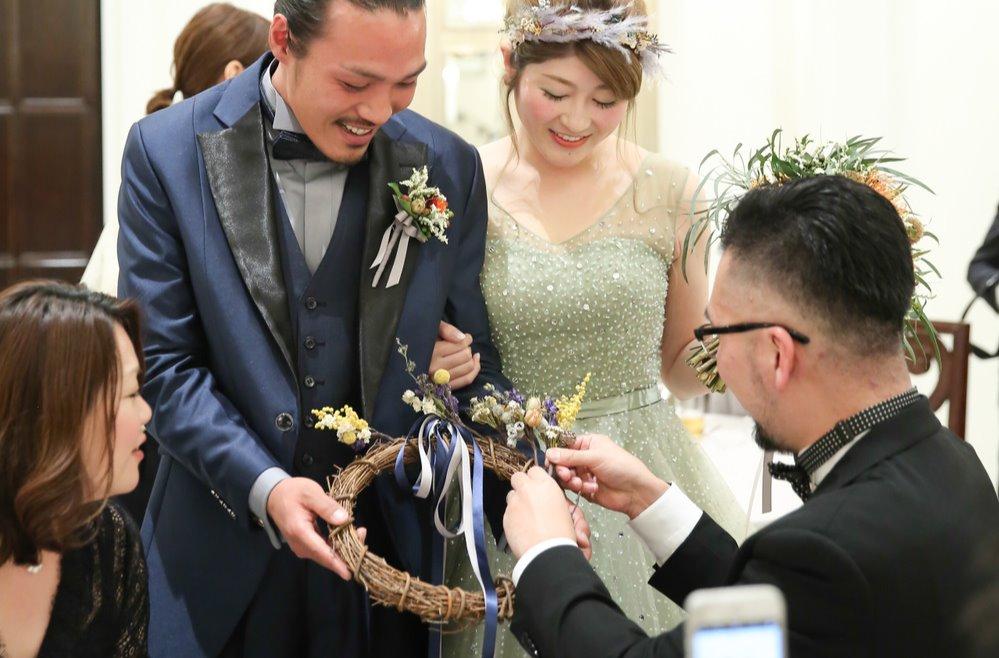 各卓ラウンドでは皆様にご挨拶をして回りながらリースづくりを手伝ってもらいました。 みんなでつくりあげたリースは永遠を表し、おふたりとゲストとの永遠のつながりを感じていただける瞬間になりました。