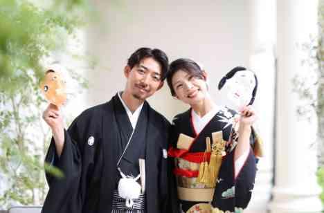 ひょっとこは「働き者」、おかめは「福を招く」という意味があり、ひょっとこの顔でおかめを笑わせ、おかめはそんなひょっとこに優しい笑顔を向けている…という昔ながらの「家庭円満」を意味する風習があります。風習や習わしも大切にされたいおふたりだからこそ、和装に合わせて縁起物のひょっとことおかめのお面を被って再入場!