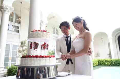 おふたりの結婚式のウェディングケーキは、まさにインパクト抜群!高さがあり、シャンパングラスで間をつないでいるケーキは、鮮やかな色合いと美しいデザインでゲストの目を引きました。ケーキが登場した瞬間にゲストから湧き上がる歓声!メインセレモニーの一つ、ケーキカットの瞬間は皆の笑顔と歓声で溢れ、特別な思い出となりました!