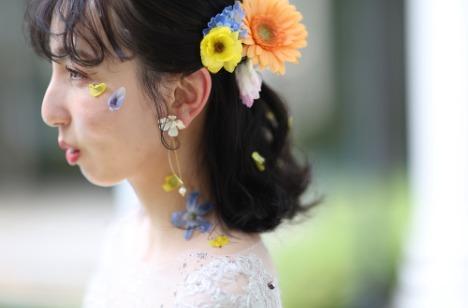 フローリストと一緒に作り上げたオリジナルの生花ヘアパーツ&ボディパーツ。ヘアには無造作に散らした小花を、頬と首に、まるで“花をまとった”ような装いに仕上がりました。 「鏡を見るたびに心がときめいた。ドレスだけでは伝えきれない“自分らしさ”を、花という自然のエッセンスで表現した、世界にひとつだけのスタイリングが完成しました。