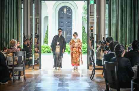 挙式後は白無垢姿でゲストをお出迎え、そして、色打掛にお色直しをされてのご披露宴入場となりました。華やかなお衣装へのチェンジにゲストの皆様もとてもお喜びになられていました。ガーデンよりシャボン玉いっぱいの中のご入場は、和装がとても映えていました。
