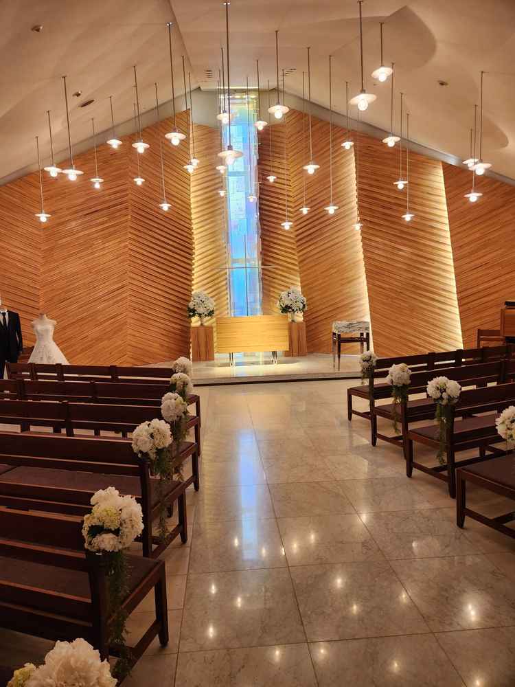 落ち着いた高級感ある式場でよかったです。チャペル(式場)の座席が斜めに配置されており、新郎新婦が入場する際に後ろを向きやすいような配慮がされていたのが好印象でした。