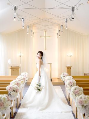 館内選べるチャペルのうちのひとつ、王道のかわいい&綺麗が叶う「ホワイトチャペル」は、大理石のバージンロードが美しい会場。