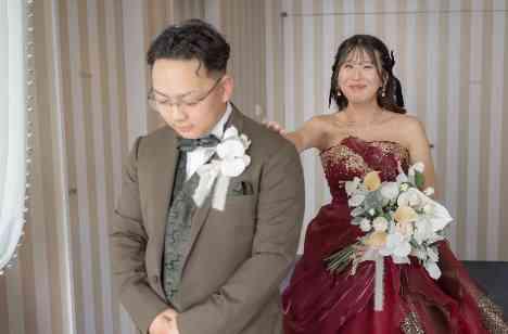 赤いカラードレスは、情熱的で愛情を象徴する色! 新郎に初披露の瞬間です!緊張してる新郎さまと、反応を楽しむ新婦さま。お写真を見てるだけで雰囲気が伝わります。もちろん、素敵なドレスに、再入場でもゲストの皆さまから大歓声があがっていました。 再入場ではブーケセレモニーで、ゲストから一本ずつひまわりを受け取り、最後に新婦に手渡すされました。ひまわりの黄色が赤いドレスに映えてとっても素敵でした。