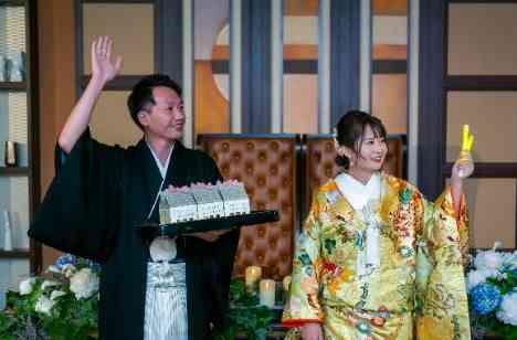 ご披露宴の中でお色直しされたお二人は、和装にお着換えされ、新郎様は黒の紋付袴、新婦様は黄色の色打掛をお召しになりました。ウェルカムスペースで衣裳の色当てクイズを準備していたお二人。ゲストの方が思い思いに選んでくださったペンライトが光る中のご入場となりました。予想以上の正解者の多さに驚いた表情の新婦様でしたが、それだけ私の事を熟知している人達に囲まれて結婚式ができた事が幸せとおっしゃっていました。