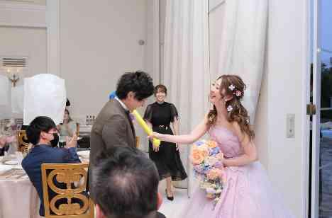 お色直し入場では、ご新婦様がどこから入場するかをご新郎様に予想していただきました。最初に選んだ扉からはご新婦様ではなく、ご友人様が登場!ピコピコハンマーで頭をポンっとたたかれた後に、次の扉の前へ。無事ご新婦様のいる扉の前にいきつきましたが、ご新婦様からも一回で当ててほしかったと、ピコピコハンマーの叩きをいただきました。会場内も笑いで包まれるお時間でした。