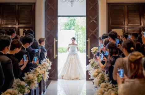 花嫁の入場シーンは皆様の視線を一気に集める瞬間です。扉が開いた瞬間、柔らかい光がバージンロードを照らす挙式会場だからこそ、花嫁さまを何よりも美しく輝かせてくれます。大切なご家族様や、かけがえのないご友人様に見守られて、ゆっくりと入場するその姿は息をのむほど美しかったです。ご親族様だけでなく、ご友人様も涙されている姿が印象的でした。