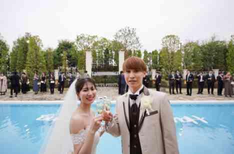 披露宴前に青空広がるプール付きガーデンで乾杯!光のチャペルでの挙式の後、ゲストのみなさまがガーデンに足を運ぶとシャンパンが用意されており、プールを全員で囲みながらシャンパンで乾杯を行いました。ゲストのみなさまにとっても、新鮮で新しい!とお声をいただきました。一人一人とグラスを交わしながらパーティのスタートを飾る華やかな時間となりました。