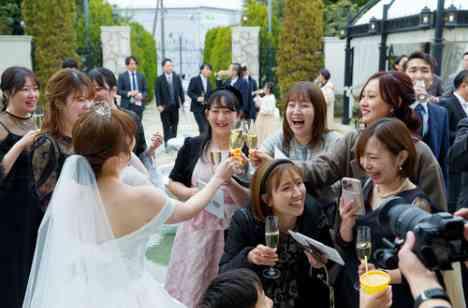 挙式のあとは早速乾杯。ガーデンにでると沢山のグラスが並んでおり、ゲストの皆様へ振る舞われました。おふたりの乾杯の発声と一緒に、ある友人ゲストには特別な巨大ビッググラスをご用意!周りのゲストから笑いや笑顔など楽しい雰囲気に。披露宴に入る前からゲストの皆さんとの距離を近く、グラスを交わしながら写真を撮ったり談笑できる時間に。