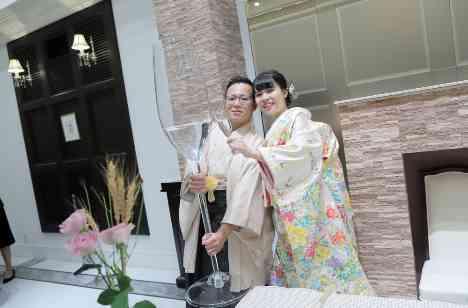 お酒が大好きなお二人だからこその演出をおこないました。 ウェディングケーキを食べさせあうファーストバイトのように、お酒を飲ませあいしました。 和装にぴったりの演出である鏡開きをし、その樽酒を使用しました。 樽酒は、披露宴の乾杯でゲストにもおすそ分けをしました。