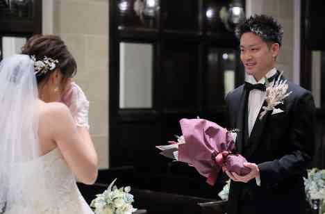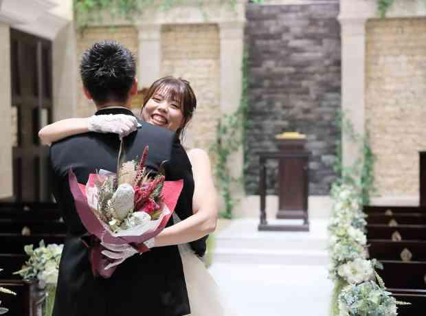 ゲストと一緒に楽しむことを中心に考えたご結婚式の中で、友達から始まったお二人のご関係だからこそ、何年先もお互いに想い合うお二人でいてほしい、という思いで、挙式前にお二人だけの時間をご提案しました。ご新郎様と、ご新婦様のいらっしゃらない時に相談を重ね、ファーストミートの際、ご新郎様からご新婦様の好きなお花を用いた花束をサプライズでプレゼントしていただきました。感極まって涙をされるご新婦様でした。