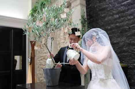 和装婚では定番の水合わせの儀。お二人が生まれ育ったご実家の水を一つに注ぎ合わせる儀式のことですが、お二人は、夫婦の木として知られているオリーブを用いて、植樹の儀をしていただきました。受付時間にゲストから書いてもらった、直筆メッセージがくくられたオリーブに水を注ぎ、お二人とご両家様の今後の末永い結びつきを誓いました。オリーブの木はお二人の新居のリビング飾られ、大切に育てられるそう。