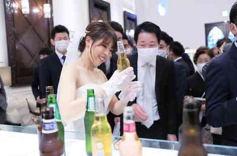 お二人が求めていたのは、堅苦しくない、ゲストと沢山会話が出来、お酒を飲みながら笑いあえるカジュアルな披露宴。ボトルドリンクをお二人から手渡ししていただいたことで、お二人とゲスト一人一人が顔を合わせてお話しが出来る時間が出来ました。飲んで食べて楽しんでくださいのお二人の掛け声にゲストも大盛り上がり。そんな雰囲気で始まった披露宴だからこそ、結びの時間まで笑顔溢れる披露宴になりました。