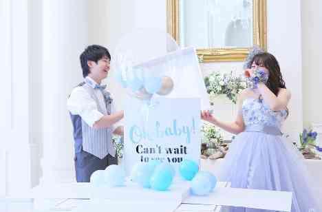 ご結婚式までお腹の赤ちゃんの性別を内緒にしてバルーンのお色で発表をする『ジェンダーリビール』を行いましたブルーだと男の子、ピンクだと女の子。ご家族の予想は男の子、女の子半々。バルーンの入ったプレゼントボックスをオープンしていただくとブルーのバルーンが浮かび上がりました。ご家族の皆様からは「やっぱり!!」「嬉しい!」というお声と拍手が鳴りやまなかったお時間でした。