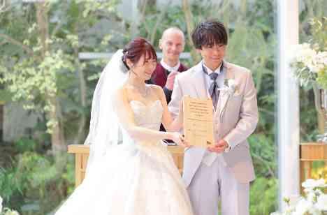 皆様に見守られながら進めたお二人の挙式。 開放感ある式場での誓いの時間はみんながうらやむあたたかい時間となりました! 結婚証明書は木製証明書をチョイス。木の年輪は世界に一つしかない模様で、二人だけの証明書となり、式後も思い出せる記念品となりました♪ 署名後は皆様へのお披露目もしていただき和やかなシーンに