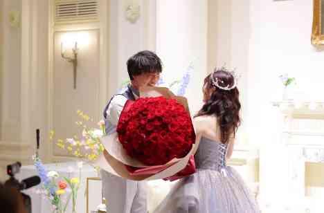 この思い出の1日だからこそ、ご新婦様にも感謝の気持ちを伝え喜んでもらいたいと、歌とバラを100本をプレゼント! お二人とも気持ちが溢れる素敵な時間となりました♪ とても緊張されていましたが、当日まで一緒に考えてきたサプライズが大成功になって良かったです 会場スタッフにとっても、忘れられないシーンとなりました