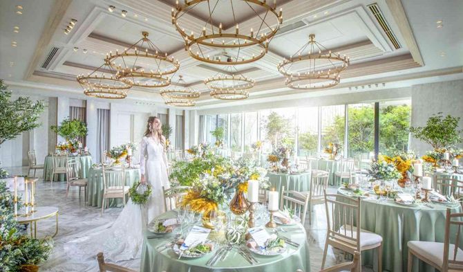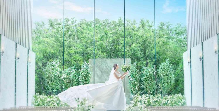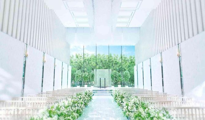 緑・空・光がリゾート感を演出する純白のチャペル。一面の窓から降り注ぐ自然光は天井のクリスタルを煌めかせ、花嫁を一層きれいに引き立てます。圧巻のスケールのチャペルは一目見た瞬間にため息がこぼれるほど。素敵なチャペルで一足先に感動の挙式体験を