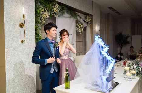お色直しをサプライズでガーデンから入場したのちに、もう1つご用意していたサプライズを決行することに!新婦様から新郎様とゲストの皆様へ、新しい命の性別発表サプライズを行いました。魔法の液体を注ぐと、ピンクかブルーに変化するサプライズ演出。いざ運命の瞬間は...!ブルーに輝き男の子と判明!喜ぶ新郎様をご覧になり目に涙を浮かべる新婦様。会場も感動とおめでとう!という声に包まれ温かい瞬間となりました!
