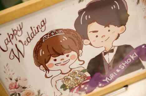 ウェルカムスペースにはおふたりの素敵な似顔絵が! ゲストの皆様もカメラを向けてたくさん写真を撮られていました♪ このようなグッズからもおふたりらしさ全開で おふたりの好みと思い出、ゲストの皆様との思い出のお写真を飾って オリジナル空間を作ることで喜んでいただけますし、 お写真にも残ります♪
