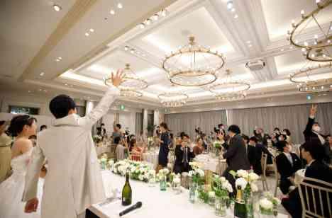 披露宴が始まり、盛り上がる乾杯の瞬間! 各卓代表者1名とご新郎ご新婦様とじゃんけんをしていただき勝ち残った1卓にドンペリをご提供♪ 皆様の楽しそうな笑顔にご新郎ご新婦様も 喜びになられていました! このような演出もおふたりがお打合せの際にゲストの皆様の笑顔を思い浮かべながら楽しそうに考えられています!