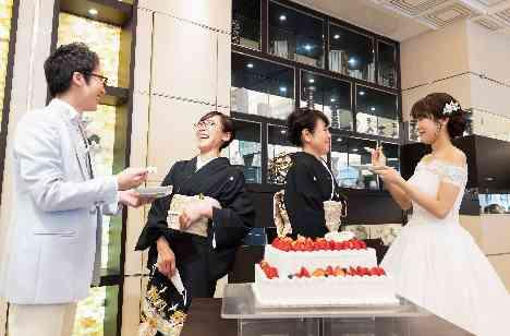 披露宴では定番のケーキ入刀の演出も! おふたりで行うファーストバイトをしたのちにご両家のお母様に向けてサンクスバイトを行いました♪ お母様方は照れ臭そうでしたが、なかなかこんな機会はないと笑顔で行っていただきました! ご家族の皆様もカメラを構えて沢山お写真を収めてくださいました♪ 会場全体がアットホームな空間になりました♡