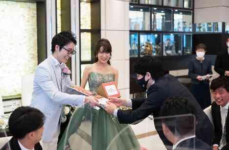 お色直し入場後はおふたりから素敵なサプライズが! 再入場曲当てクイズを行い、ゲストの皆様には事前に選んでおいていただいた曲が当たっていたらなんとおふたりからプレゼントをご用意♪ また優しいおふたりは外れてしまった方にも楽しんでいただけるように外れてしまった方の中から抽選でおふたりとお写真を撮れるというお時間も作ってくださいました! ゲストの皆様とみんなで大盛り上がりでした♪