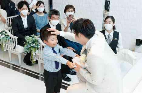 挙式はおふたりのオリジナリティ溢れ、ゲストの皆様にも参加していただける人前式♪ 指輪交換の際に協力してくれたのは可愛い1人の男の子!今回のリングボーイは新郎様の甥っ子さんです♪ 挙式が始まる前からずっと緊張の面持ちで席に座ってくれていました! いざ時間になると緊張していた顔から凛々しいかっこいい顔になりしっかりおふたりの元へ届けてくれました♡