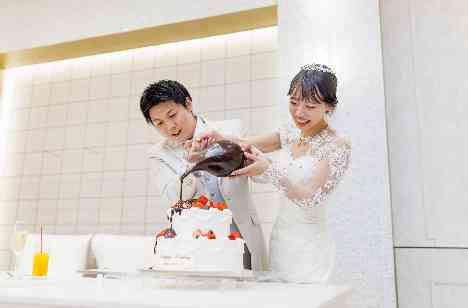 披露宴前半の盛り上がりポイントは『ウェディングケーキドロップス』!! 結婚式では定番のケーキ入刀ではなく苺の乗った真っ白なケーキにチョコソースを司会とゲストの皆様の「せーの!」の合図で初めての共同作業です♡ 素敵なワンシーンを見逃さぬようゲストの皆様も近くで写真を撮る方や「おめでとう!」と声をかけてくださっていました!