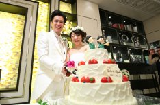 フロア貸切の会場を、フローリストと相談して上質な雰囲気に装花で飾り付けました。ケーキはおふたりのご希望をパティシエが実現した力作!ご新婦様が働く小学校で、学級通信に書く『フクイくん』と、ご新婦様をイメージした人形を作りケーキをおふたりだけのオリジナルに。また、お色直しは両家お母様にそれぞれエスコートしてもらい、仲の良さを皆様にご披露されました。