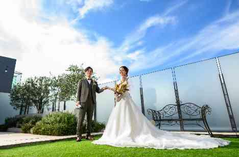 ここはゲストの皆様のお待合のお部屋 秋晴れで空気が気持ち良い特別な日に、お二人もテラスに出ちゃいました...!!! お天気にも恵まれ、青空の下でこれから始まる特別な一日にスタッフもワクワクが止まりません。 淡いお色味のブーケが差し色になっていてドレスが映えています♡ご新郎様も秋っぽいカーキ色で素敵なタキシードです...!