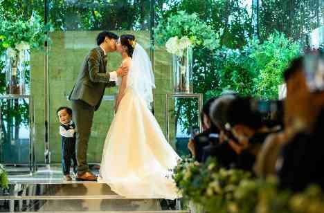 さあクリスタルチャペルでの挙式がスタートです! この日、足元に写るおふたりのお姿やシャンデリアがとっても幻想的で印象的でした。 そんなお二人のもとに指輪を届けてくれたのは.... リングボーイのS君✨みんなに見守られながら パパとママのところまで運べました! 誓いのキスシーンにはパパの足元からひょっこり覗いてます!