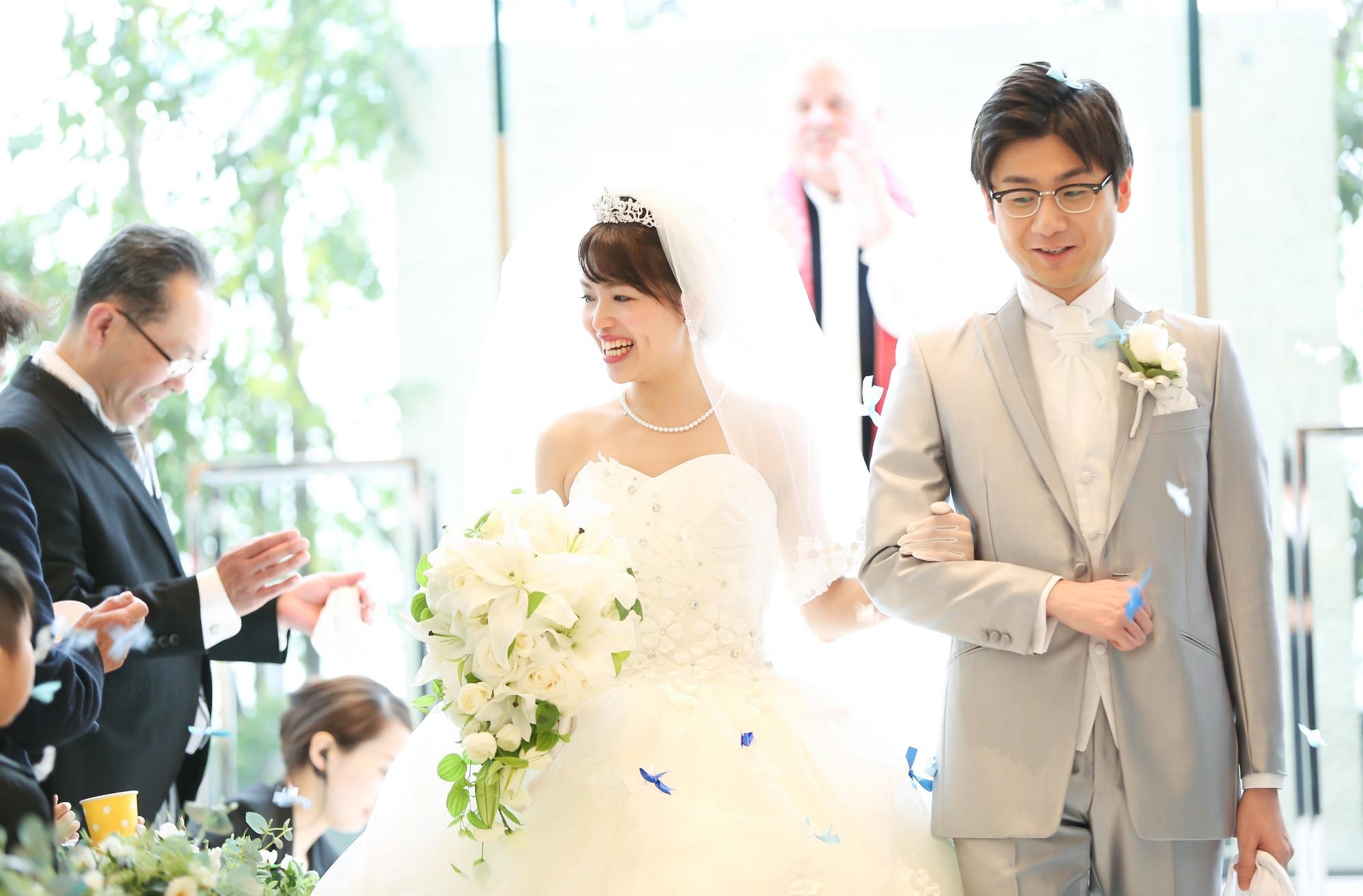 自然光が差し込み、おふたりもゲストも、明るい笑顔がたくさんの、幸せが詰まった挙式シーンに。