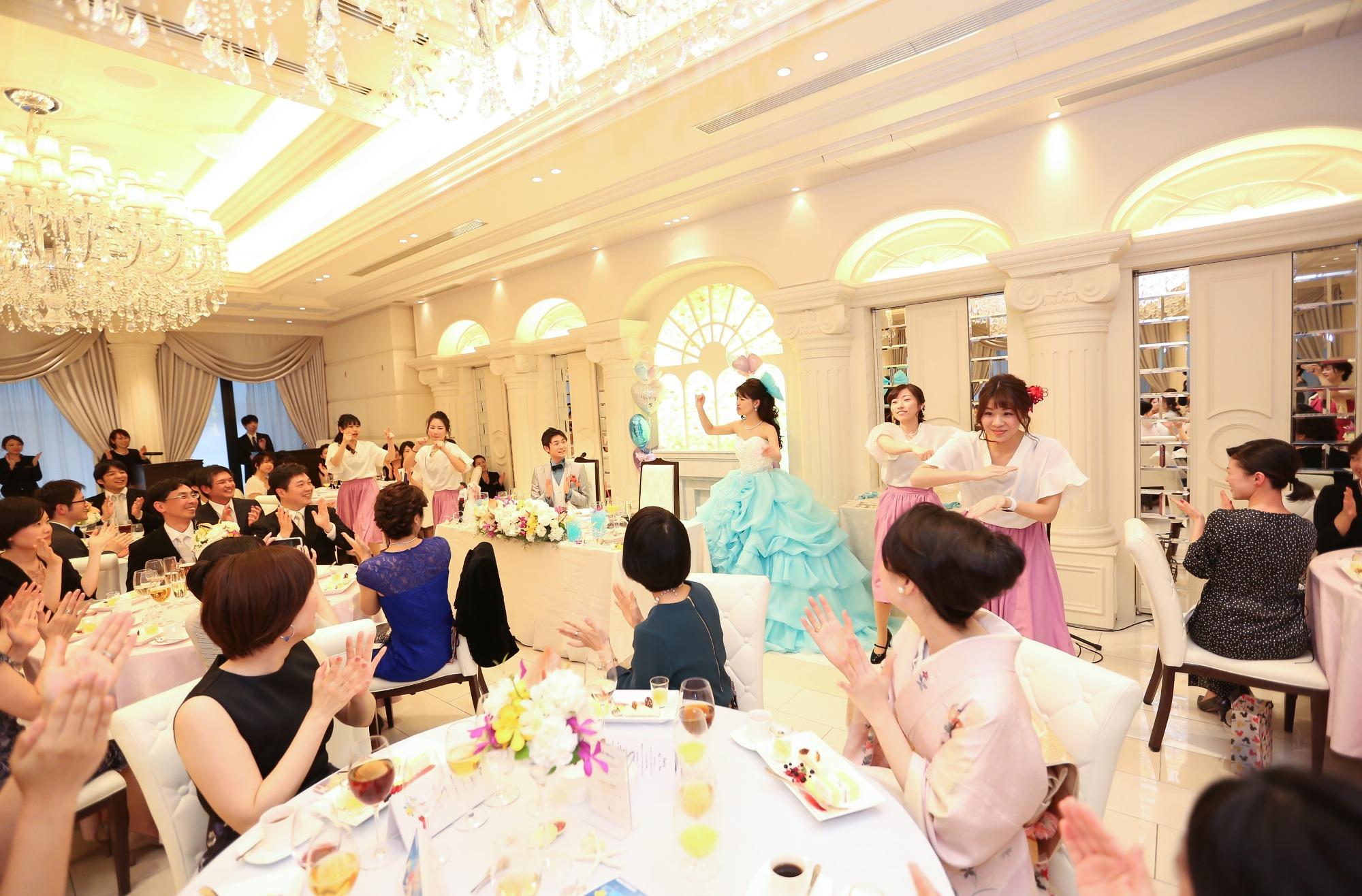 余興シーンではゲスト全員はもちろん、ご新婦様もダンスに参加!パーティ会場全体が一体感に包まれ、大盛り上がりのパーティに!