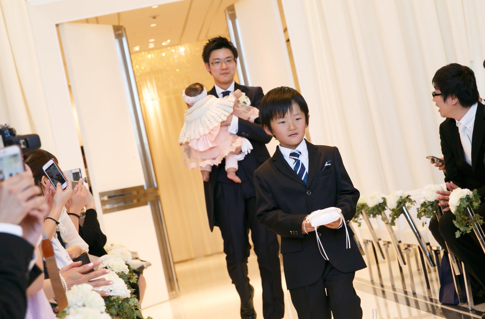 お二人の入場シーンには大切なお子様に加えて、可愛いリングボーイとトレーンガールにも参加してもらい、会場全体が温かい雰囲気に包まれました。