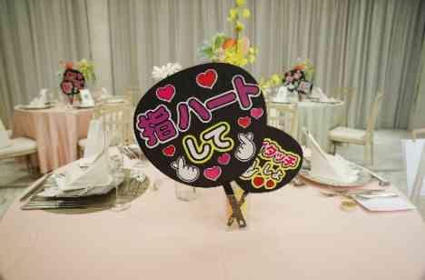 「それぞれの推しカラーがピンクなのでピンクコーディネートをしたい!」と初回のお打ち合わせからテーマカラーが決まっていたお二人。 会場全体にピンクのカラーを取り入れ、各卓にはアイドルのコンサートのようなペンライトやうちわをおき、ゲストの方にパーティを楽しんでいただけるようなアイテムも取り入れたお二人こだわりのコーディネートとなりました。