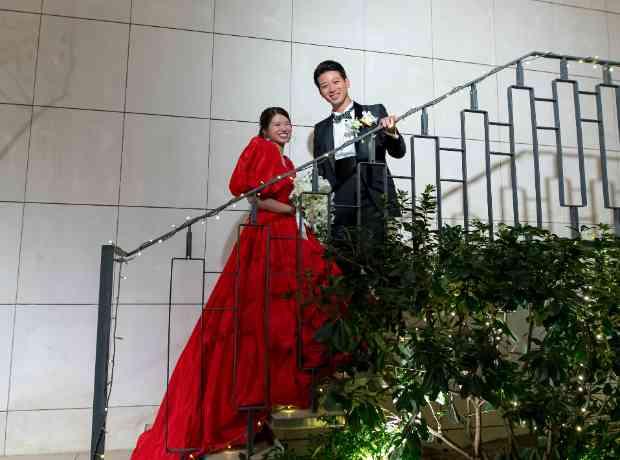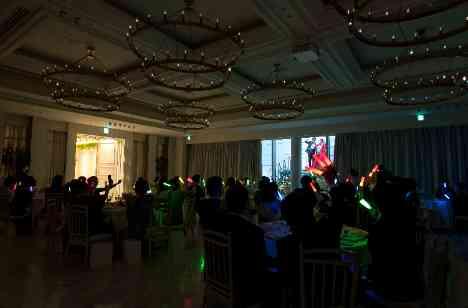 パーティスタート前に、再入場のBGM当てクイズを皆様に出題されていたお二人。答えとなるサイリウムを皆様手にし、会場が色鮮やかな輝きを放つ中いよいよお二人の再入場!! 会場が光輝く中、ガーデンからご入場されたお二人! お二人の華やかなお姿ともに答えのBGMも流れ、会場全体が大盛り上がりとなった再入場でした☆